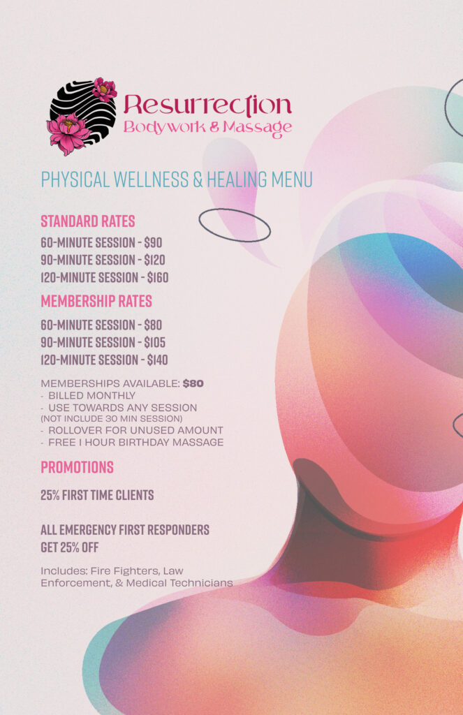 At Ressurection Bodyworks & Massage, we view self-care as a foundation for strength, clarity, and long-term wellness. Through focused bodywork like Deep Tissue and Sports Massage, we help release deep-seated tension, improve mobility, and support recovery for both the physically active and the chronically stressed. These techniques aren’t just about relief — they’re a form of body maintenance that enhances performance, reduces injury risk, and promotes physical resilience. Complementary services like Trigger Point Therapy, Myofascial Release, Assisted Stretching, and Relaxation Massage round out a holistic approach, ensuring every session meets your unique needs — whether you’re preparing for action, coming down from it, or simply needing space to reset. Self-care begins when you choose to listen to your body — and we’re here to help you respond with purpose. Here is what we offer…